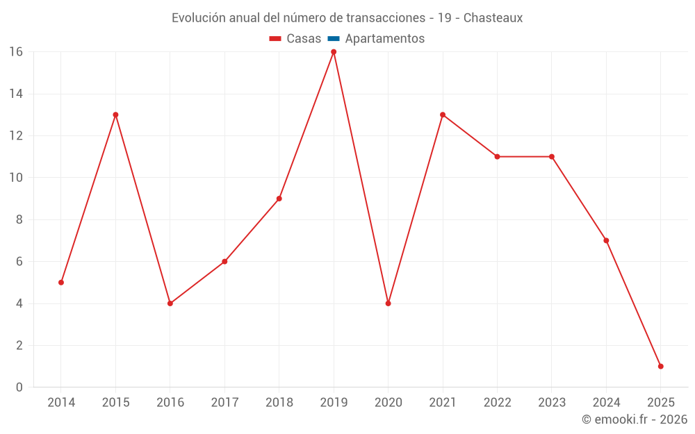 El precio mediano en las 16 transacciones de casas de los últimos 24 meses en la comuna de Chasteaux fue de 1 758 € por metro cuadrado para un valor patrimonial medio de 119 500 €. Durante este período el 60% de las transacciones estuvieron entre 1 055 y 2 179 € por metro cuadrado (del 2º al 8º decil).