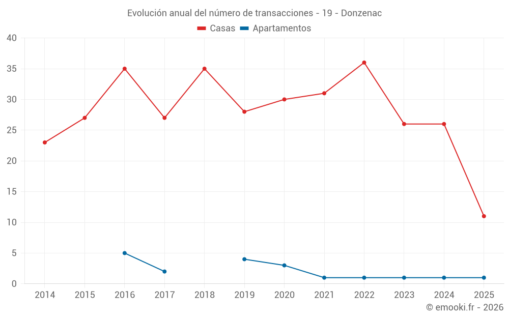 El precio mediano en las 25 transacciones de casas de los últimos 12 meses en la comuna de Donzenac fue de 1 417 € por metro cuadrado para un valor patrimonial medio de 130 000 €. Durante este período el 60% de las transacciones estuvieron entre 972 y 2 015 € por metro cuadrado (del 2º al 8º decil).