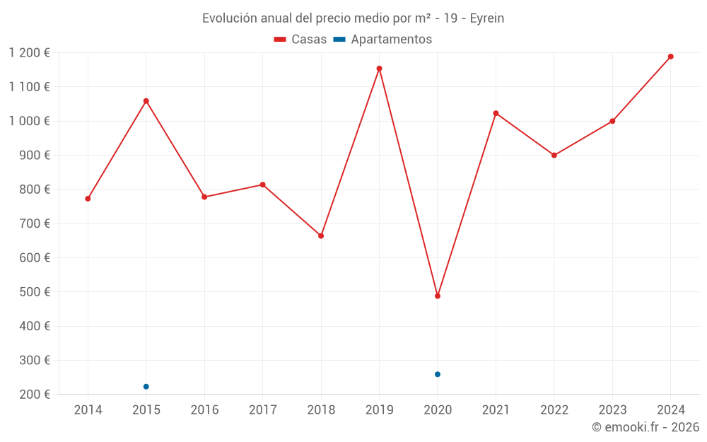 El precio mediano en las 15 transacciones de casas de los últimos 24 meses en la comuna de Eyrein fue de 1 000 € por metro cuadrado para un valor patrimonial medio de 80 000 €. Durante este período el 60% de las transacciones estuvieron entre 708 y 1 742 € por metro cuadrado (del 2º al 8º decil).