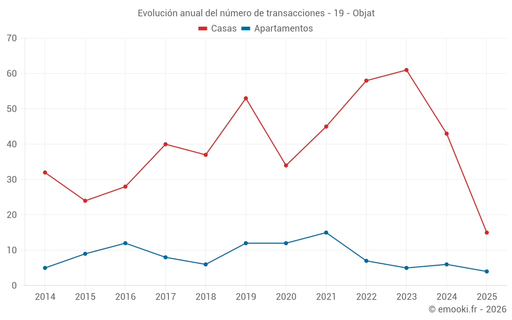 El precio mediano en las 41 transacciones de casas de los últimos 12 meses en la comuna de Objat fue de 1 607 € por metro cuadrado para un valor patrimonial medio de 114 063 €. Durante este período el 60% de las transacciones estuvieron entre 979 y 2 222 € por metro cuadrado (del 2º al 8º decil).