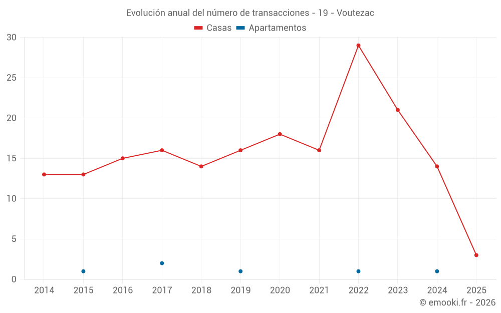 El precio mediano en las 29 transacciones de casas de los últimos 24 meses en la comuna de Voutezac fue de 1 388 € por metro cuadrado para un valor patrimonial medio de 122 000 €. Durante este período el 60% de las transacciones estuvieron entre 502 y 1 889 € por metro cuadrado (del 2º al 8º decil).