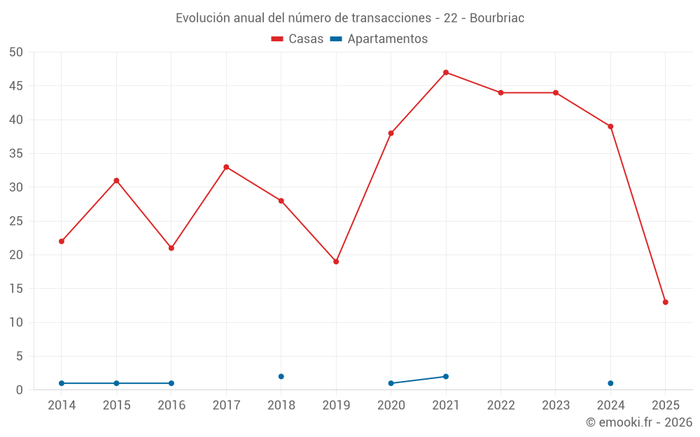 El precio mediano en las 37 transacciones de casas de los últimos 12 meses en la comuna de Bourbriac fue de 1 414 € por metro cuadrado para un valor patrimonial medio de 102 098 €. Durante este período el 60% de las transacciones estuvieron entre 807 y 2 176 € por metro cuadrado (del 2º al 8º decil).