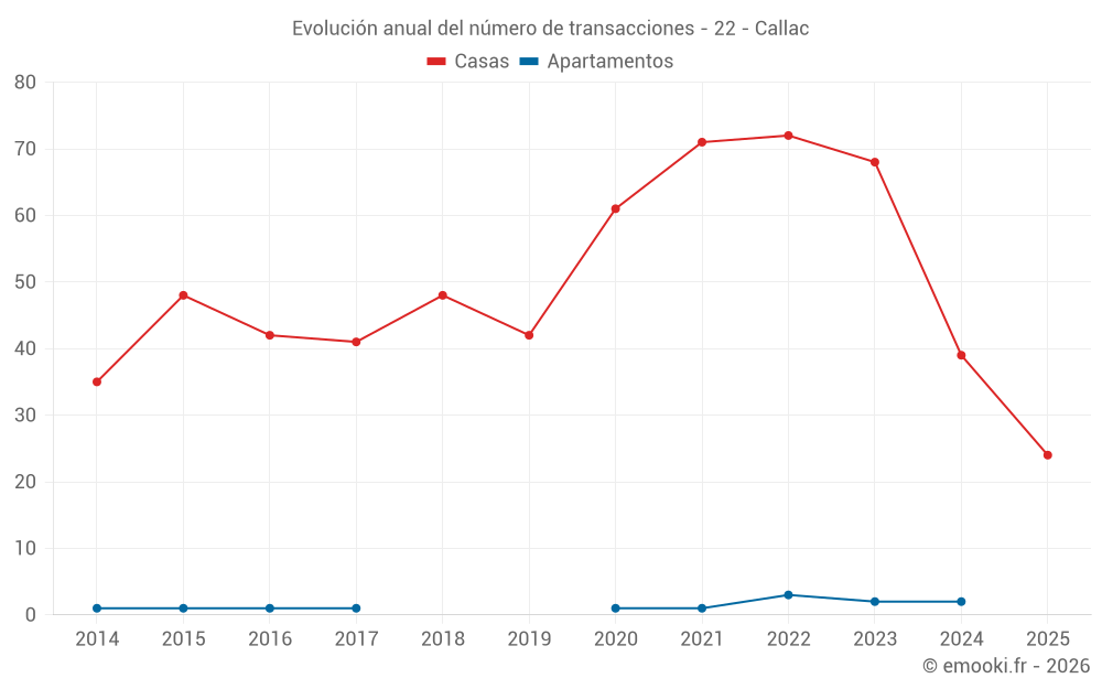 El precio mediano en las 24 transacciones de casas de los últimos 6 meses en la comuna de Callac fue de 1 147 € por metro cuadrado para un valor patrimonial medio de 95 000 €. Durante este período el 60% de las transacciones estuvieron entre 697 y 1 453 € por metro cuadrado (del 2º al 8º decil).
