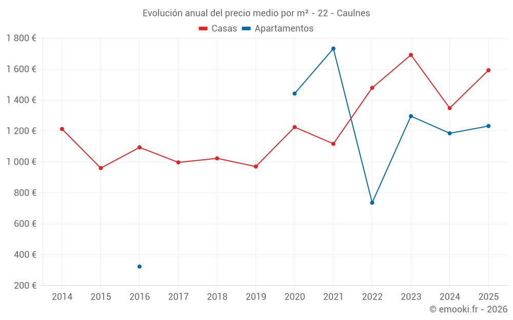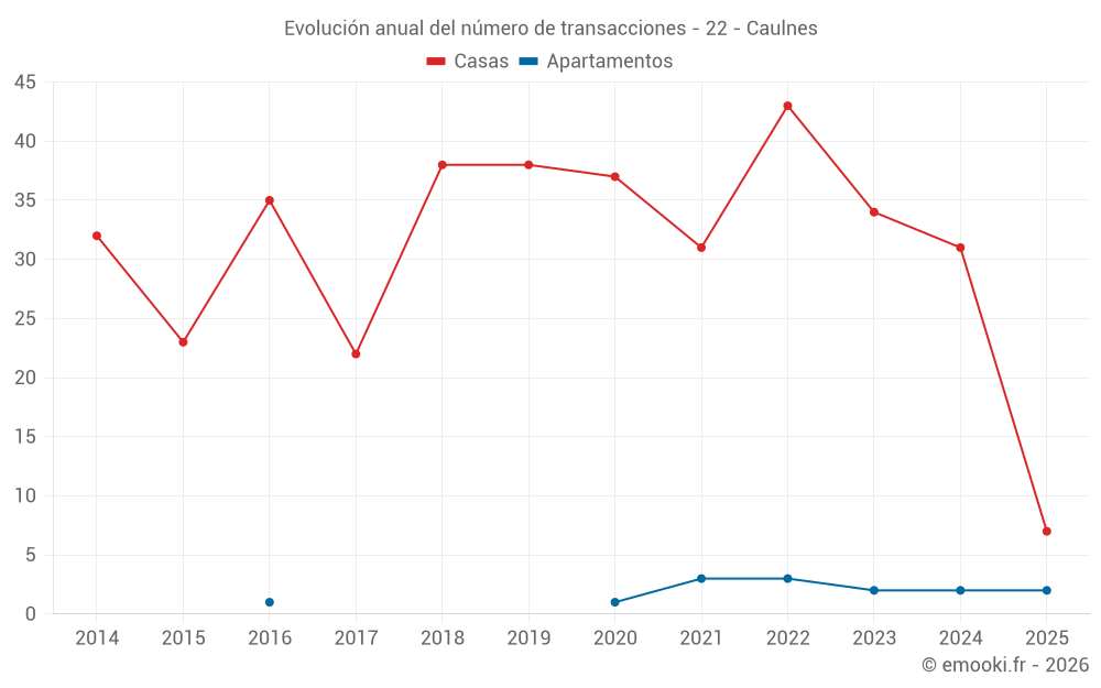 El precio mediano en las 22 transacciones de casas de los últimos 12 meses en la comuna de Caulnes fue de 1 575 € por metro cuadrado para un valor patrimonial medio de 166 500 €. Durante este período el 60% de las transacciones estuvieron entre 934 y 2 278 € por metro cuadrado (del 2º al 8º decil).