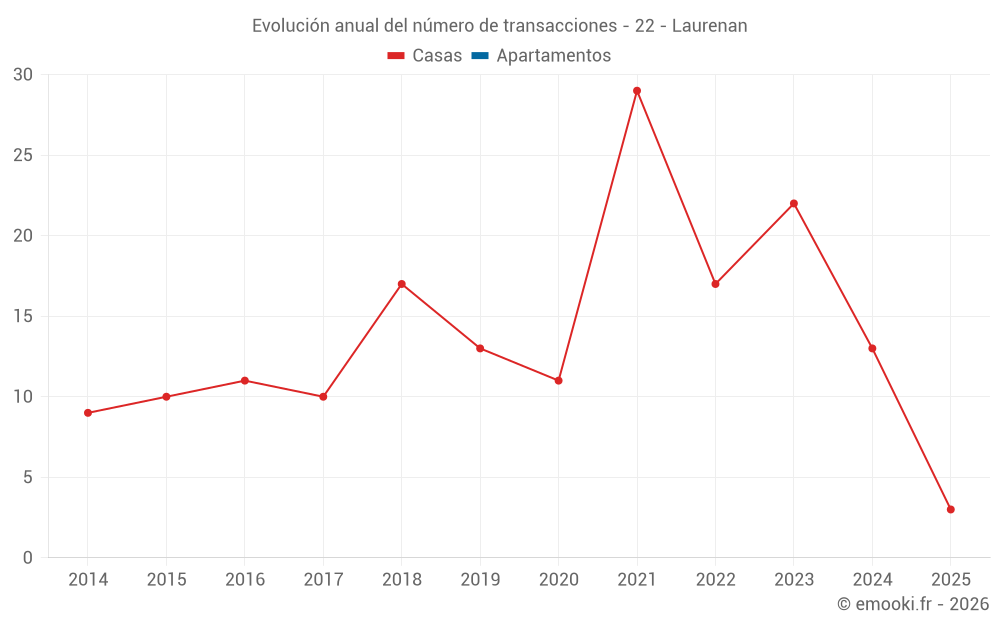 El precio mediano en las 28 transacciones de casas de los últimos 24 meses en la comuna de Laurenan fue de 1 094 € por metro cuadrado para un valor patrimonial medio de 78 500 €. Durante este período el 60% de las transacciones estuvieron entre 665 y 1 441 € por metro cuadrado (del 2º al 8º decil).