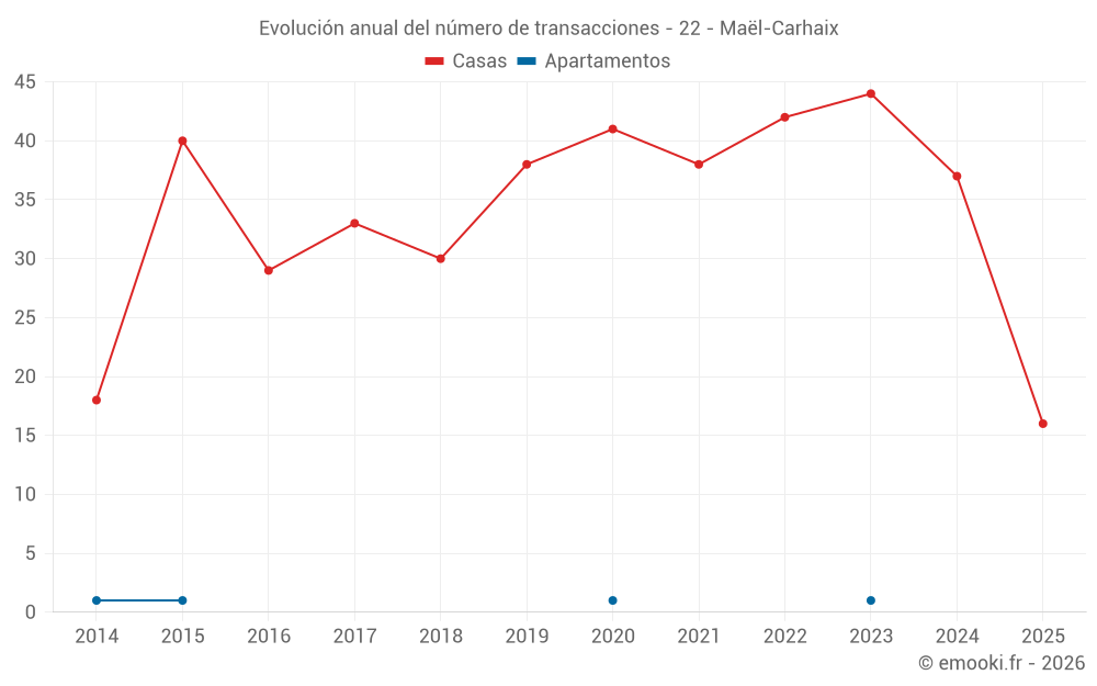 El precio mediano en las 33 transacciones de casas de los últimos 12 meses en la comuna de Maël-Carhaix fue de 1 020 € por metro cuadrado para un valor patrimonial medio de 85 000 €. Durante este período el 60% de las transacciones estuvieron entre 606 y 1 383 € por metro cuadrado (del 2º al 8º decil).