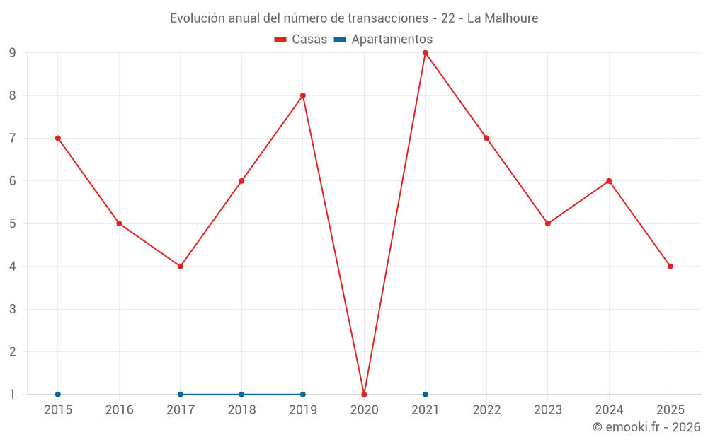 El precio mediano en las 15 transacciones de casas de los últimos 24 meses en la comuna de La Malhoure fue de 2 065 € por metro cuadrado para un valor patrimonial medio de 190 000 €. Durante este período el 60% de las transacciones estuvieron entre 1 757 y 2 335 € por metro cuadrado (del 2º al 8º decil).