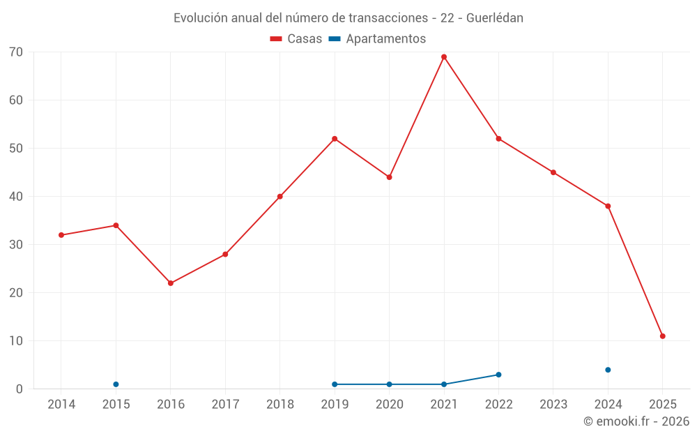 El precio mediano en las 30 transacciones de casas de los últimos 12 meses en la comuna de Guerlédan fue de 1 322 € por metro cuadrado para un valor patrimonial medio de 117 500 €. Durante este período el 60% de las transacciones estuvieron entre 683 y 1 903 € por metro cuadrado (del 2º al 8º decil).