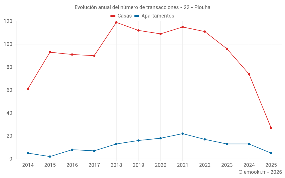 El precio mediano en las 26 transacciones de apartamentos de los últimos 24 meses en la comuna de Plouha fue de 2 354 € por metro cuadrado para un valor patrimonial medio de 119 000 €. Durante este período el 60% de las transacciones estuvieron entre 1 921 y 2 889 € por metro cuadrado (del 2º al 8º decil).