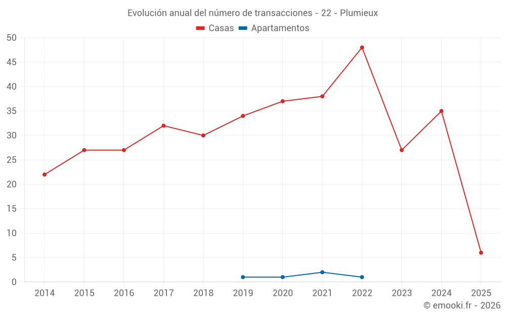 El precio mediano en las 29 transacciones de casas de los últimos 12 meses en la comuna de Plumieux fue de 1 171 € por metro cuadrado para un valor patrimonial medio de 77 500 €. Durante este período el 60% de las transacciones estuvieron entre 670 y 1 552 € por metro cuadrado (del 2º al 8º decil).