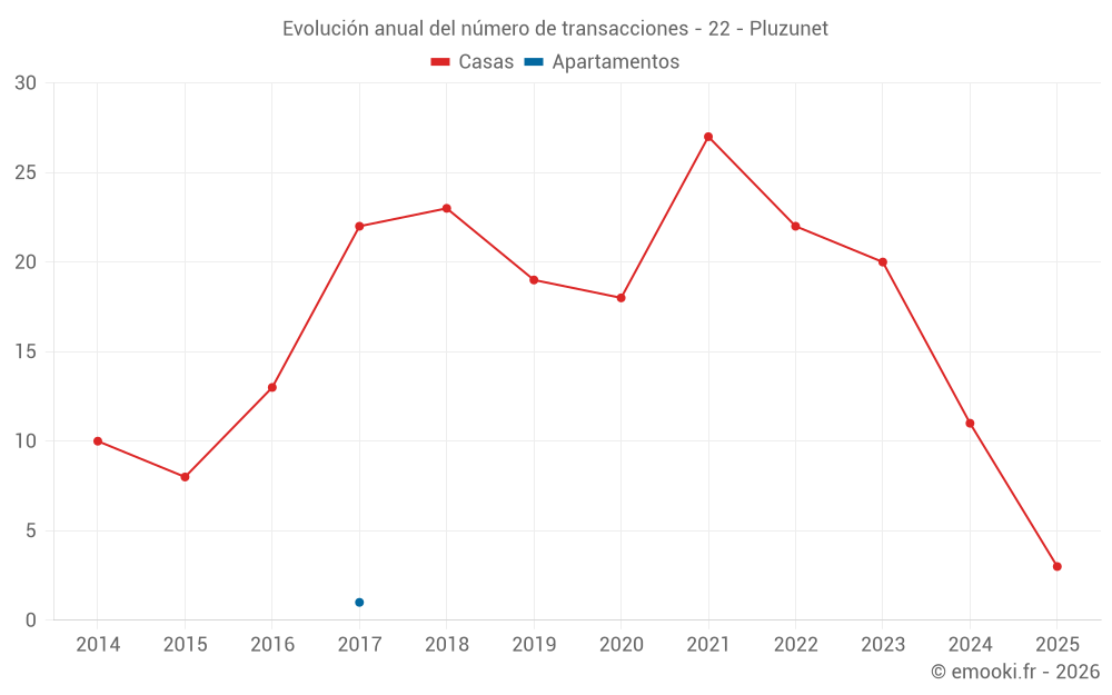 El precio mediano en las 28 transacciones de casas de los últimos 24 meses en la comuna de Pluzunet fue de 1 500 € por metro cuadrado para un valor patrimonial medio de 119 000 €. Durante este período el 60% de las transacciones estuvieron entre 1 058 y 1 990 € por metro cuadrado (del 2º al 8º decil).