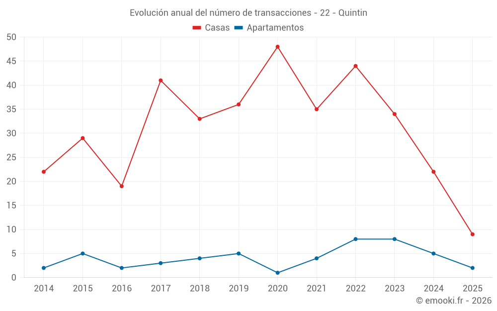 El precio mediano en las 23 transacciones de casas de los últimos 12 meses en la comuna de Quintin fue de 1 867 € por metro cuadrado para un valor patrimonial medio de 165 000 €. Durante este período el 60% de las transacciones estuvieron entre 1 569 y 2 229 € por metro cuadrado (del 2º al 8º decil).