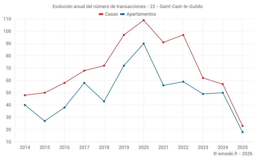 El precio mediano en las 18 transacciones de apartamentos de los últimos 6 meses en la comuna de Saint-Cast-le-Guildo fue de 4 309 € por metro cuadrado para un valor patrimonial medio de 174 250 €. Durante este período el 60% de las transacciones estuvieron entre 3 159 y 5 767 € por metro cuadrado (del 2º al 8º decil).