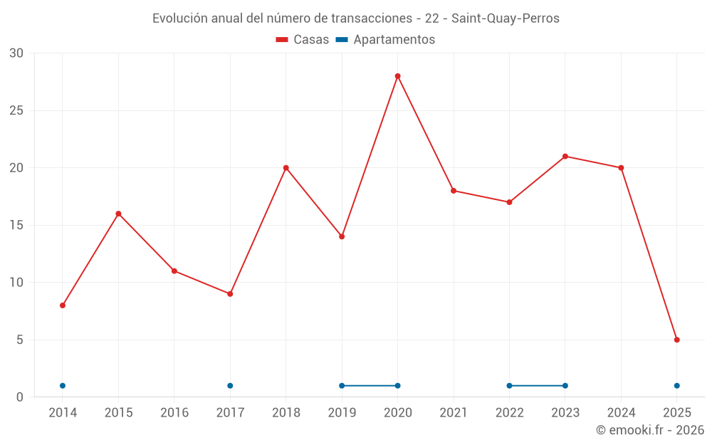El precio mediano en las 18 transacciones de casas de los últimos 12 meses en la comuna de Saint-Quay-Perros fue de 3 183 € por metro cuadrado para un valor patrimonial medio de 305 500 €. Durante este período el 60% de las transacciones estuvieron entre 2 408 y 3 411 € por metro cuadrado (del 2º al 8º decil).