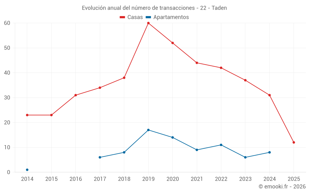 El precio mediano en las 26 transacciones de casas de los últimos 12 meses en la comuna de Taden fue de 2 246 € por metro cuadrado para un valor patrimonial medio de 214 525 €. Durante este período el 60% de las transacciones estuvieron entre 1 829 y 2 649 € por metro cuadrado (del 2º al 8º decil).