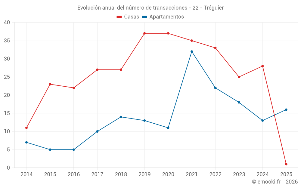 El precio mediano en las 21 transacciones de apartamentos de los últimos 12 meses en la comuna de Tréguier fue de 1 800 € por metro cuadrado para un valor patrimonial medio de 91 400 €. Durante este período el 60% de las transacciones estuvieron entre 1 412 y 2 130 € por metro cuadrado (del 2º al 8º decil).