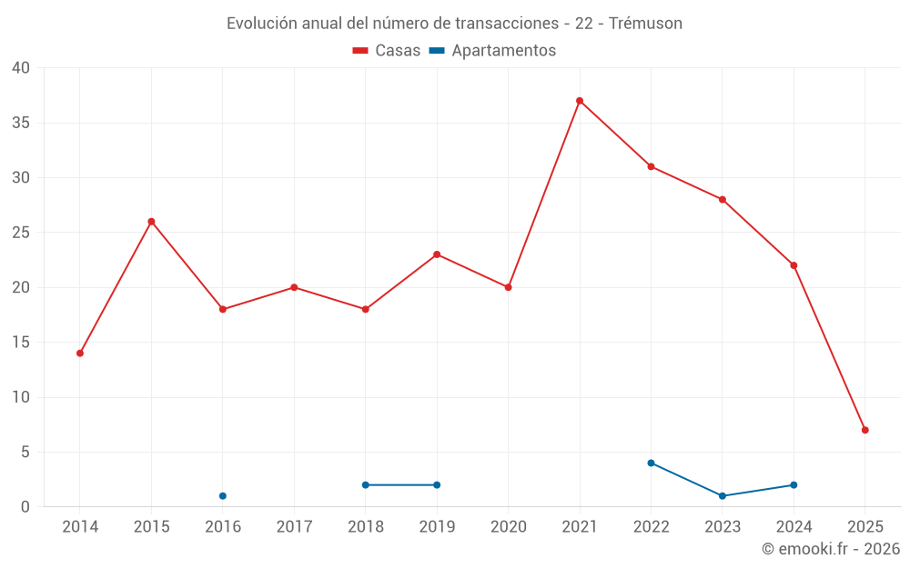 El precio mediano en las 19 transacciones de casas de los últimos 12 meses en la comuna de Trémuson fue de 2 359 € por metro cuadrado para un valor patrimonial medio de 212 850 €. Durante este período el 60% de las transacciones estuvieron entre 1 928 y 2 858 € por metro cuadrado (del 2º al 8º decil).