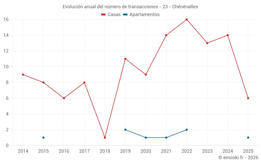 El precio mediano en las 29 transacciones de casas de los últimos 24 meses en la comuna de Chénérailles fue de 714 € por metro cuadrado para un valor patrimonial medio de 73 000 €. Durante este período el 60% de las transacciones estuvieron entre 302 y 1 211 € por metro cuadrado (del 2º al 8º decil).