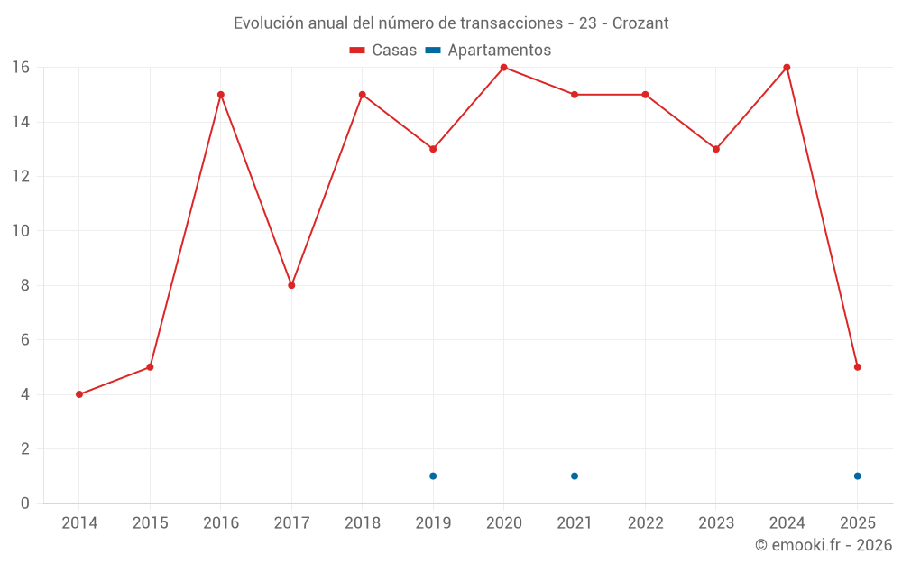 El precio mediano en las 27 transacciones de casas de los últimos 24 meses en la comuna de Crozant fue de 831 € por metro cuadrado para un valor patrimonial medio de 80 000 €. Durante este período el 60% de las transacciones estuvieron entre 430 y 1 365 € por metro cuadrado (del 2º al 8º decil).