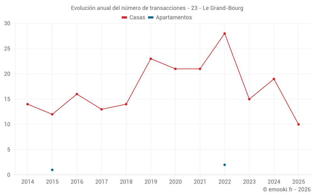 El precio mediano en las 22 transacciones de casas de los últimos 12 meses en la comuna de Le Grand-Bourg fue de 1 023 € por metro cuadrado para un valor patrimonial medio de 69 860 €. Durante este período el 60% de las transacciones estuvieron entre 615 y 1 632 € por metro cuadrado (del 2º al 8º decil).