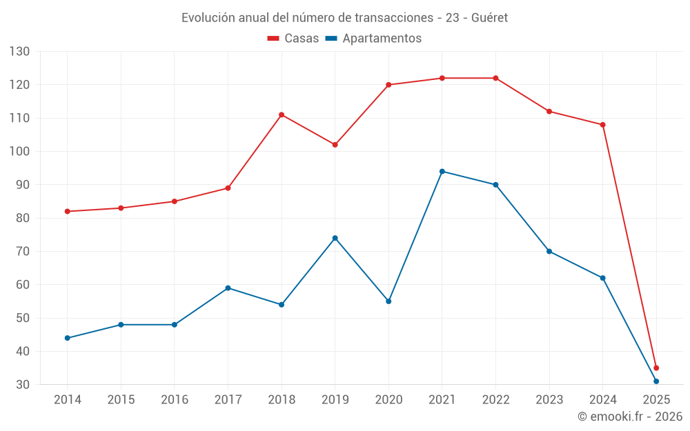 El precio mediano en las 31 transacciones de apartamentos de los últimos 6 meses en la comuna de Guéret fue de 1 071 € por metro cuadrado para un valor patrimonial medio de 74 000 €. Durante este período el 60% de las transacciones estuvieron entre 792 y 1 273 € por metro cuadrado (del 2º al 8º decil).