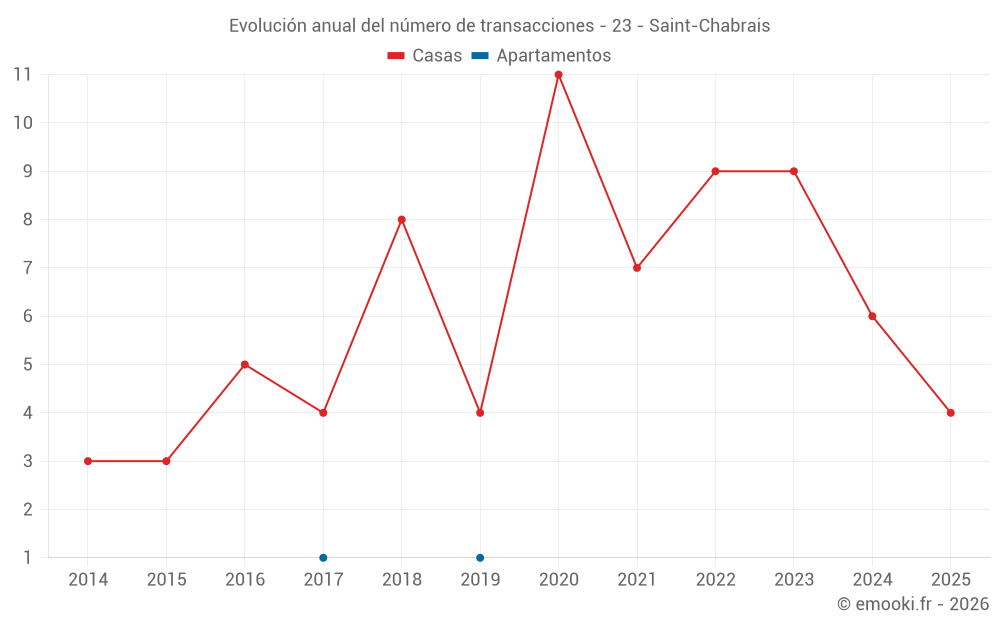 El precio mediano en las 16 transacciones de casas de los últimos 24 meses en la comuna de Saint-Chabrais fue de 755 € por metro cuadrado para un valor patrimonial medio de 87 750 €. Durante este período el 60% de las transacciones estuvieron entre 620 y 1 143 € por metro cuadrado (del 2º al 8º decil).