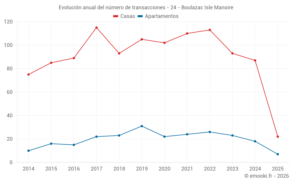 El precio mediano en las 37 transacciones de apartamentos de los últimos 24 meses en la comuna de Boulazac Isle Manoire fue de 1 705 € por metro cuadrado para un valor patrimonial medio de 91 560 €. Durante este período el 60% de las transacciones estuvieron entre 1 498 y 1 978 € por metro cuadrado (del 2º al 8º decil).