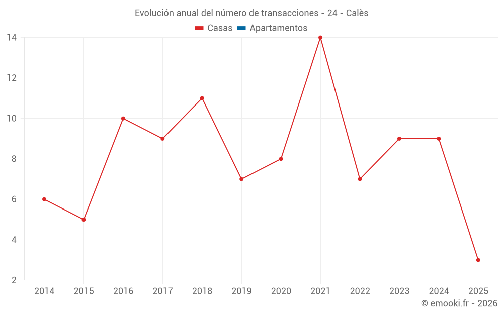 El precio mediano en las 16 transacciones de casas de los últimos 24 meses en la comuna de Calès fue de 1 872 € por metro cuadrado para un valor patrimonial medio de 216 420 €. Durante este período el 60% de las transacciones estuvieron entre 1 732 y 2 822 € por metro cuadrado (del 2º al 8º decil).