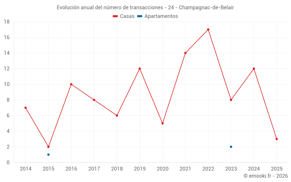 El precio mediano en las 19 transacciones de casas de los últimos 24 meses en la comuna de Champagnac-de-Belair fue de 1 193 € por metro cuadrado para un valor patrimonial medio de 124 070 €. Durante este período el 60% de las transacciones estuvieron entre 760 y 1 732 € por metro cuadrado (del 2º al 8º decil).