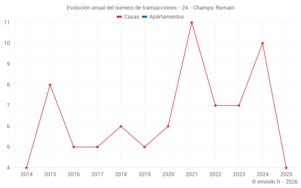 El precio mediano en las 16 transacciones de casas de los últimos 24 meses en la comuna de Champs-Romain fue de 1 288 € por metro cuadrado para un valor patrimonial medio de 158 625 €. Durante este período el 60% de las transacciones estuvieron entre 967 y 1 721 € por metro cuadrado (del 2º al 8º decil).