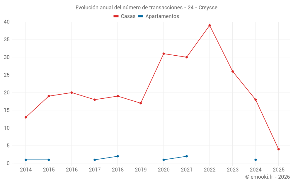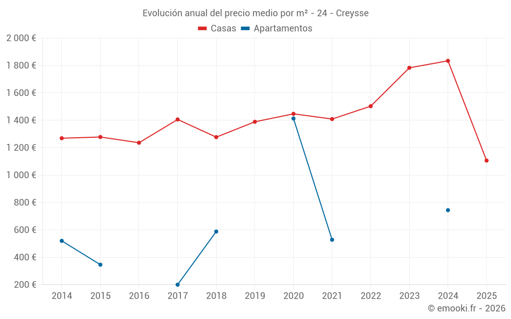 El precio mediano en las 17 transacciones de casas de los últimos 12 meses en la comuna de Creysse fue de 1 792 € por metro cuadrado para un valor patrimonial medio de 140 000 €. Durante este período el 60% de las transacciones estuvieron entre 1 466 y 2 571 € por metro cuadrado (del 2º al 8º decil).