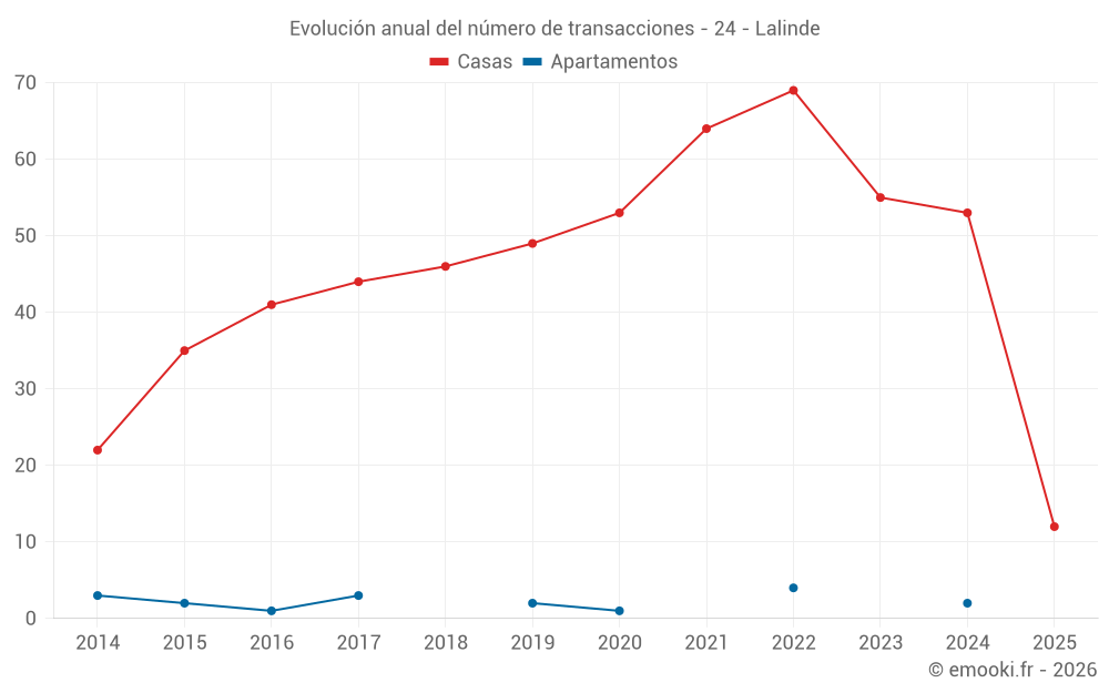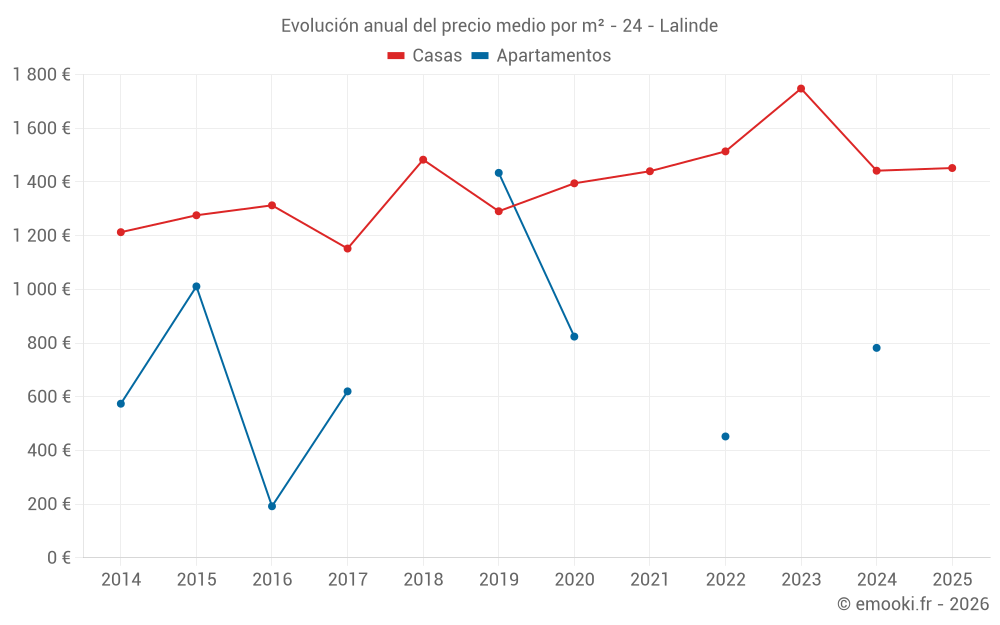 El precio mediano en las 47 transacciones de casas de los últimos 12 meses en la comuna de Lalinde fue de 1 368 € por metro cuadrado para un valor patrimonial medio de 125 000 €. Durante este período el 60% de las transacciones estuvieron entre 895 y 2 026 € por metro cuadrado (del 2º al 8º decil).