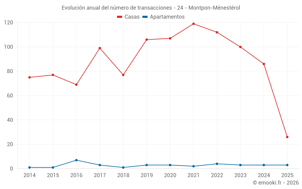 El precio mediano en las 26 transacciones de casas de los últimos 6 meses en la comuna de Montpon-Ménestérol fue de 1 445 € por metro cuadrado para un valor patrimonial medio de 115 750 €. Durante este período el 60% de las transacciones estuvieron entre 1 074 y 1 739 € por metro cuadrado (del 2º al 8º decil).