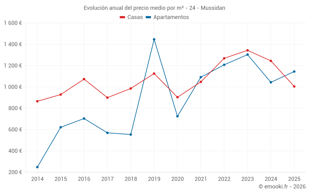 El precio mediano en las 25 transacciones de casas de los últimos 12 meses en la comuna de Mussidan fue de 1 180 € por metro cuadrado para un valor patrimonial medio de 117 000 €. Durante este período el 60% de las transacciones estuvieron entre 662 y 2 059 € por metro cuadrado (del 2º al 8º decil).