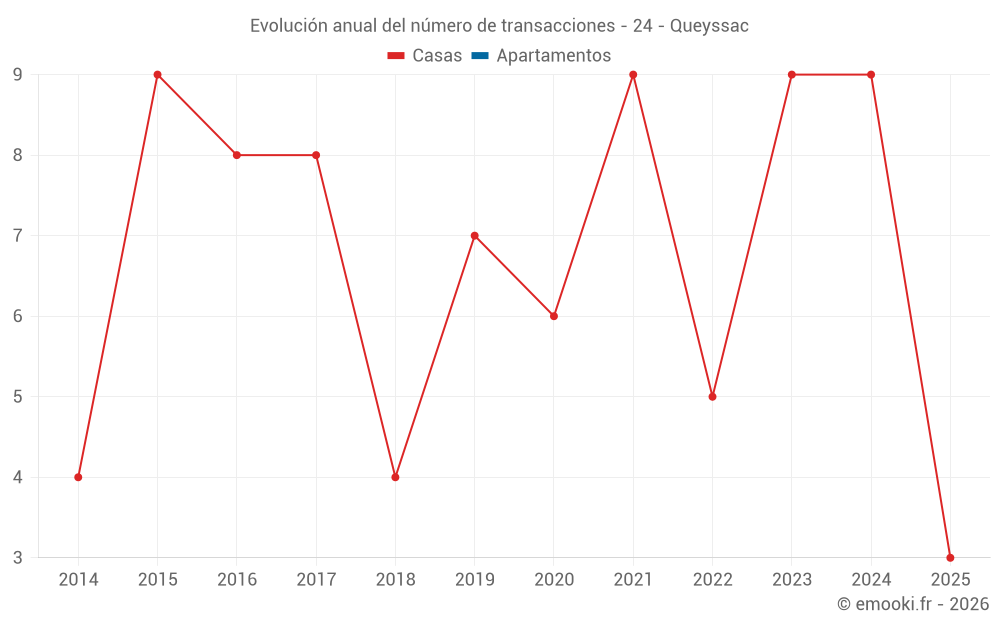 El precio mediano en las 17 transacciones de casas de los últimos 24 meses en la comuna de Queyssac fue de 1 760 € por metro cuadrado para un valor patrimonial medio de 171 000 €. Durante este período el 60% de las transacciones estuvieron entre 1 192 y 2 711 € por metro cuadrado (del 2º al 8º decil).