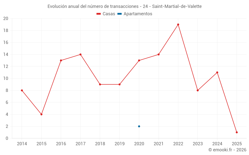 El precio mediano en las 17 transacciones de casas de los últimos 24 meses en la comuna de Saint-Martial-de-Valette fue de 973 € por metro cuadrado para un valor patrimonial medio de 137 734 €. Durante este período el 60% de las transacciones estuvieron entre 675 y 1 561 € por metro cuadrado (del 2º al 8º decil).