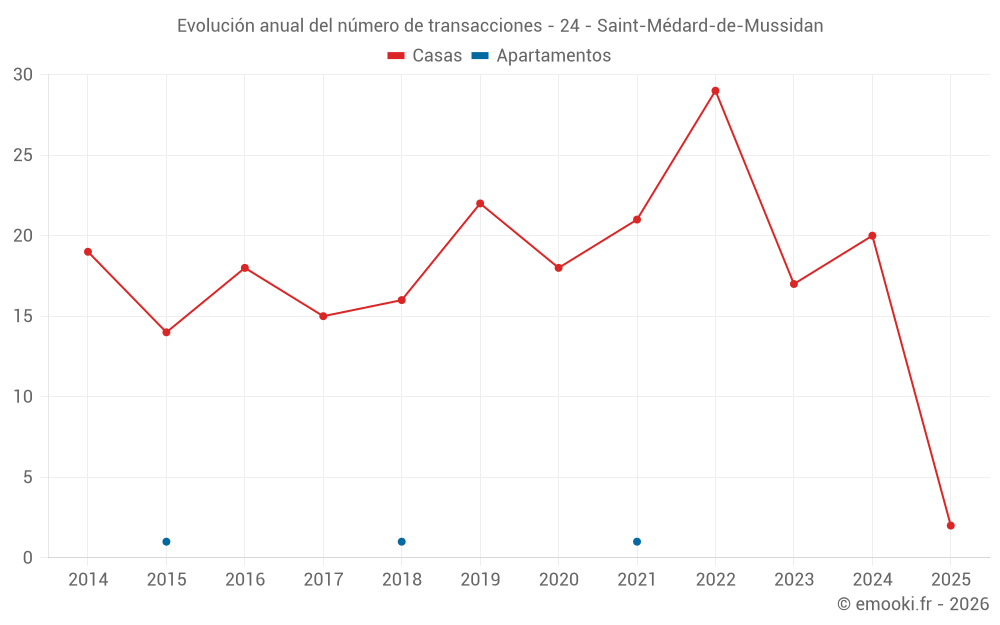 El precio mediano en las 29 transacciones de casas de los últimos 24 meses en la comuna de Saint-Médard-de-Mussidan fue de 1 380 € por metro cuadrado para un valor patrimonial medio de 118 750 €. Durante este período el 60% de las transacciones estuvieron entre 716 y 1 853 € por metro cuadrado (del 2º al 8º decil).