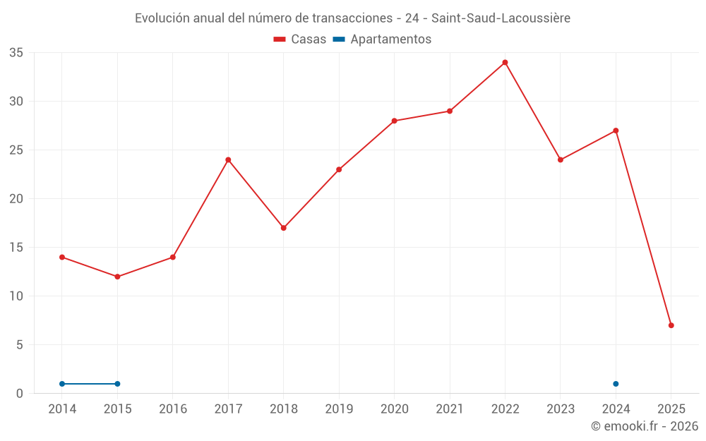 El precio mediano en las 25 transacciones de casas de los últimos 12 meses en la comuna de Saint-Saud-Lacoussière fue de 1 094 € por metro cuadrado para un valor patrimonial medio de 119 000 €. Durante este período el 60% de las transacciones estuvieron entre 924 y 1 466 € por metro cuadrado (del 2º al 8º decil).