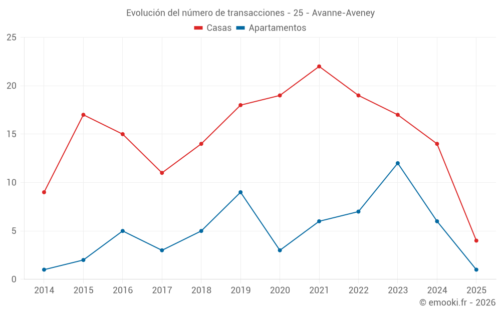 El precio mediano en las 26 transacciones de casas de los últimos 24 meses en la comuna de Avanne-Aveney fue de 2 480 € por metro cuadrado para un valor patrimonial medio de 256 500 €. Durante este período el 60% de las transacciones estuvieron entre 1 753 y 3 084 € por metro cuadrado (del 2º al 8º decil).