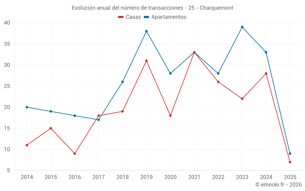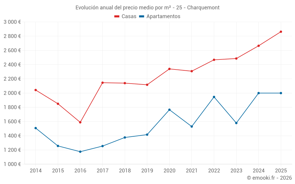 El precio mediano en las 21 transacciones de apartamentos de los últimos 12 meses en la comuna de Charquemont fue de 2 000 € por metro cuadrado para un valor patrimonial medio de 150 000 €. Durante este período el 60% de las transacciones estuvieron entre 1 391 y 2 309 € por metro cuadrado (del 2º al 8º decil).