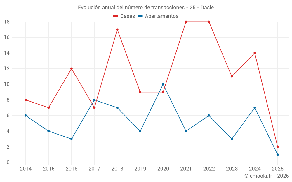El precio mediano en las 23 transacciones de casas de los últimos 24 meses en la comuna de Dasle fue de 1 602 € por metro cuadrado para un valor patrimonial medio de 155 000 €. Durante este período el 60% de las transacciones estuvieron entre 906 y 2 029 € por metro cuadrado (del 2º al 8º decil).