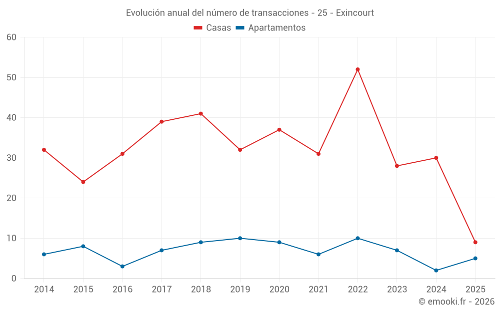 El precio mediano en las 24 transacciones de casas de los últimos 12 meses en la comuna de Exincourt fue de 1 501 € por metro cuadrado para un valor patrimonial medio de 128 100 €. Durante este período el 60% de las transacciones estuvieron entre 1 099 y 2 122 € por metro cuadrado (del 2º al 8º decil).