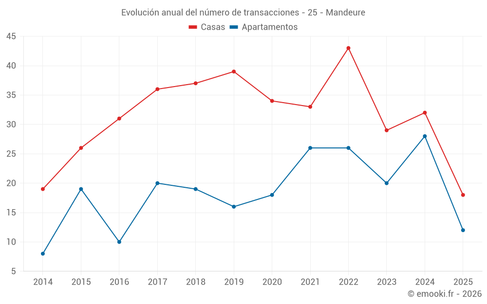 El precio mediano en las 27 transacciones de apartamentos de los últimos 12 meses en la comuna de Mandeure fue de 710 € por metro cuadrado para un valor patrimonial medio de 46 900 €. Durante este período el 60% de las transacciones estuvieron entre 575 y 1 040 € por metro cuadrado (del 2º al 8º decil).