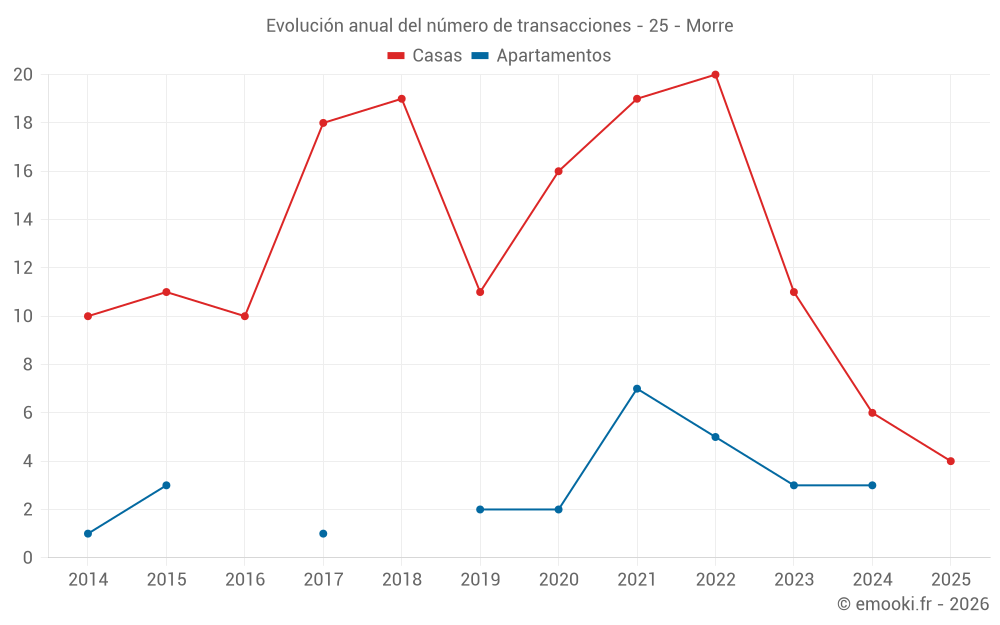 El precio mediano en las 15 transacciones de casas de los últimos 24 meses en la comuna de Morre fue de 2 462 € por metro cuadrado para un valor patrimonial medio de 238 800 €. Durante este período el 60% de las transacciones estuvieron entre 2 231 y 2 920 € por metro cuadrado (del 2º al 8º decil).