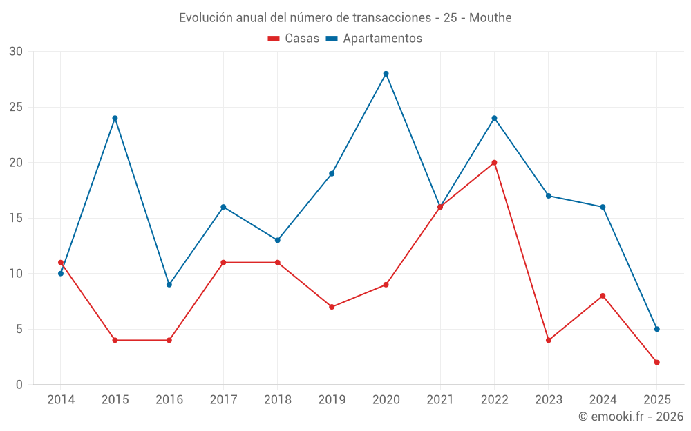El precio mediano en las 30 transacciones de apartamentos de los últimos 24 meses en la comuna de Mouthe fue de 2 116 € por metro cuadrado para un valor patrimonial medio de 137 000 €. Durante este período el 60% de las transacciones estuvieron entre 1 584 y 2 614 € por metro cuadrado (del 2º al 8º decil).