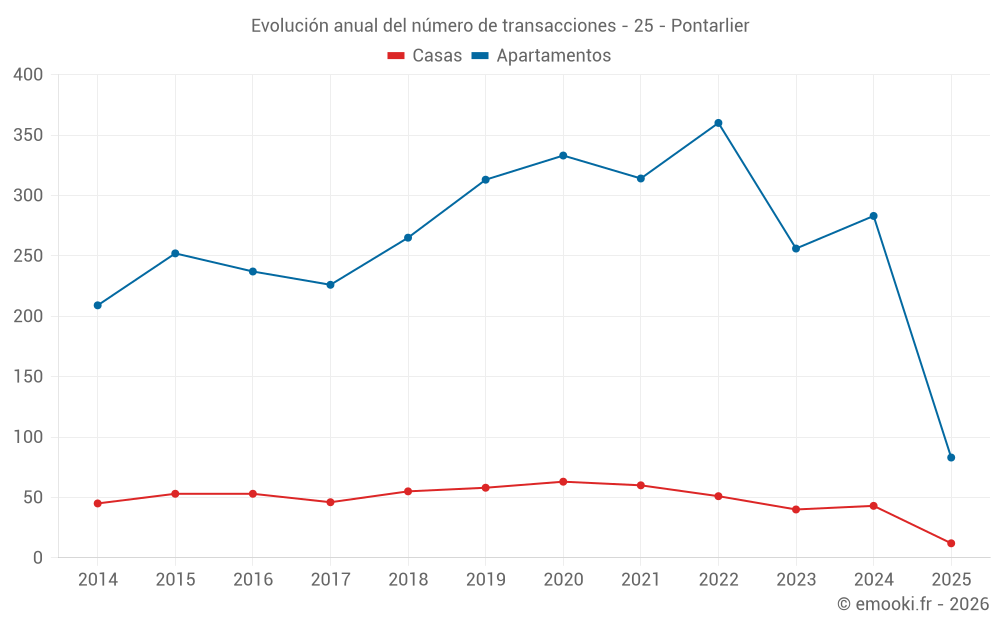 El precio mediano en las 37 transacciones de casas de los últimos 12 meses en la comuna de Pontarlier fue de 3 307 € por metro cuadrado para un valor patrimonial medio de 318 000 €. Durante este período el 60% de las transacciones estuvieron entre 2 634 y 3 773 € por metro cuadrado (del 2º al 8º decil).