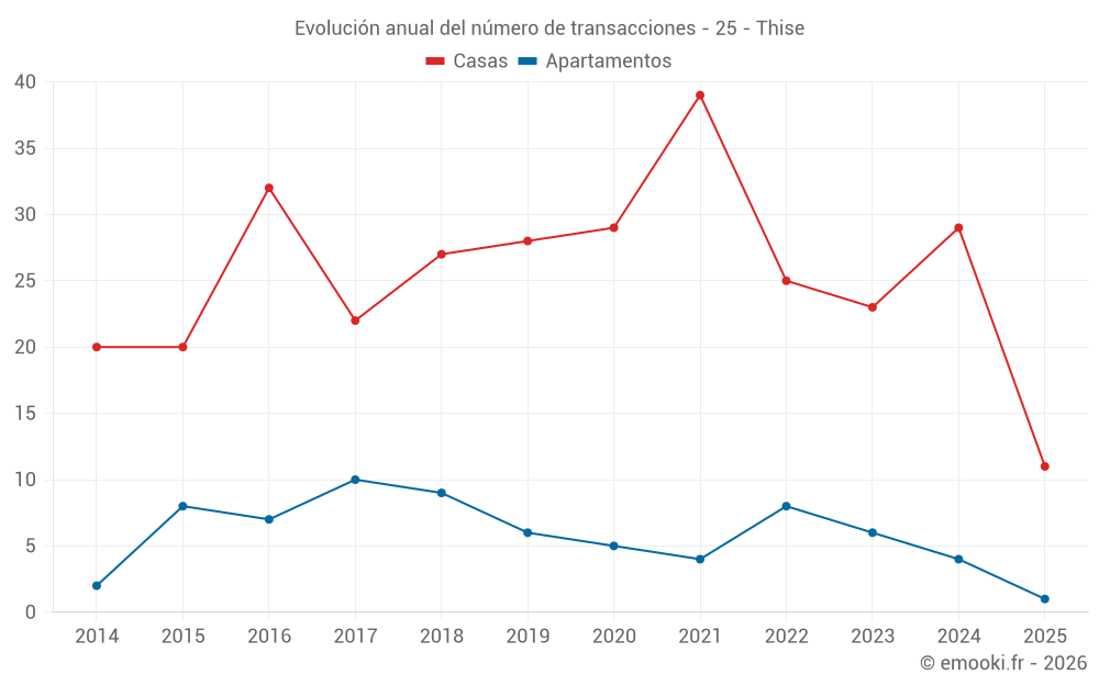 El precio mediano en las 29 transacciones de casas de los últimos 12 meses en la comuna de Thise fue de 2 272 € por metro cuadrado para un valor patrimonial medio de 230 000 €. Durante este período el 60% de las transacciones estuvieron entre 1 922 y 2 625 € por metro cuadrado (del 2º al 8º decil).