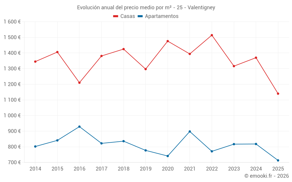 El precio mediano en las 34 transacciones de apartamentos de los últimos 12 meses en la comuna de Valentigney fue de 714 € por metro cuadrado para un valor patrimonial medio de 52 500 €. Durante este período el 60% de las transacciones estuvieron entre 469 y 1 090 € por metro cuadrado (del 2º al 8º decil).
