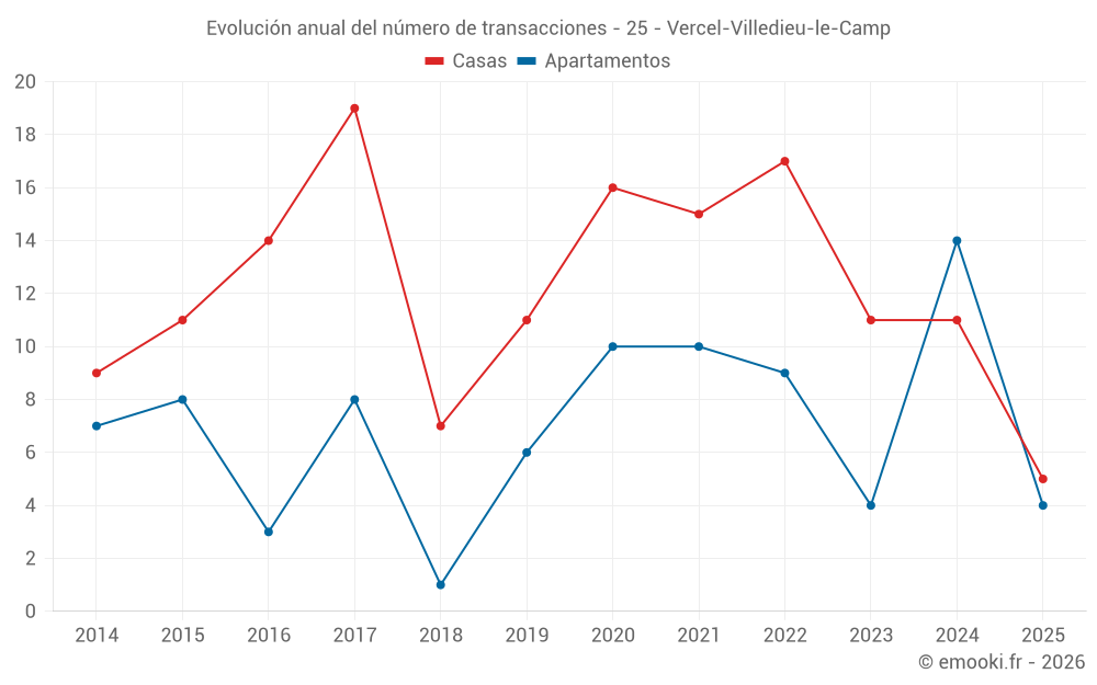 El precio mediano en las 20 transacciones de apartamentos de los últimos 24 meses en la comuna de Vercel-Villedieu-le-Camp fue de 1 526 € por metro cuadrado para un valor patrimonial medio de 120 000 €. Durante este período el 60% de las transacciones estuvieron entre 951 y 1 911 € por metro cuadrado (del 2º al 8º decil).