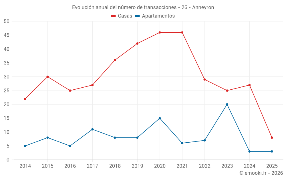 El precio mediano en las 28 transacciones de casas de los últimos 12 meses en la comuna de Anneyron fue de 2 308 € por metro cuadrado para un valor patrimonial medio de 210 750 €. Durante este período el 60% de las transacciones estuvieron entre 1 603 y 2 799 € por metro cuadrado (del 2º al 8º decil).